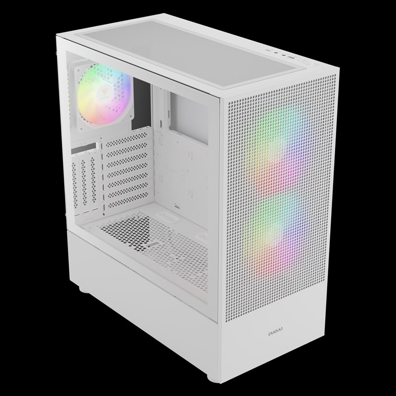 Dòng TALOS M3 MESH, với màu đen mờ và trắng tuyết, là một vỏ máy dạng tháp giữa tập trung vào việc tối đa hóa khả năng tương thích và hiệu suất luồng khí. Nó được trang bị 02 quạt PWM ARGB 140mm ở phía trước và 01 quạt 120mm ở phía sau, mặt trước dạng lưới đục lỗ mang đến vẻ ngoài thanh lịch.