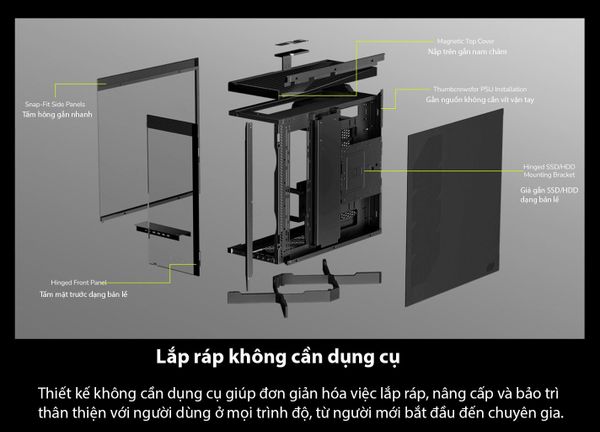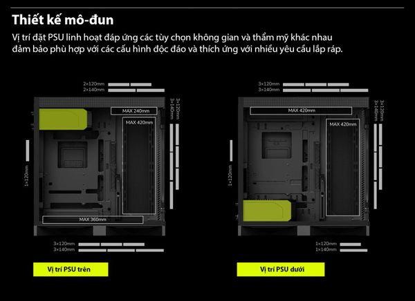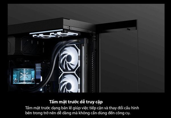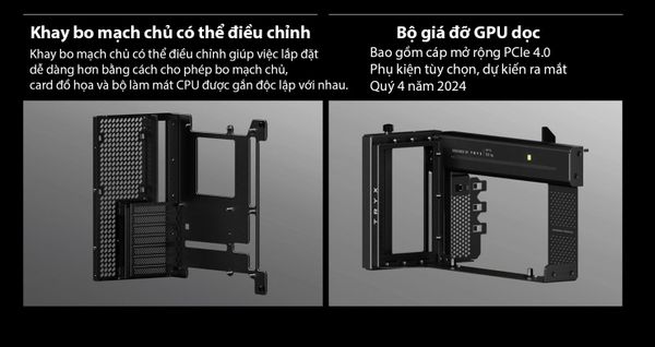 Khay main có thể điều chỉnh, cho phép gắn CPU và tản nhiệt trước khi cố định vào case. Thiết kế PSU mô-đun linh hoạt (trên/dưới) giúp người dùng tự do chọn bố cục tối ưu theo ý thích và nhu cầu thẩm mỹ.