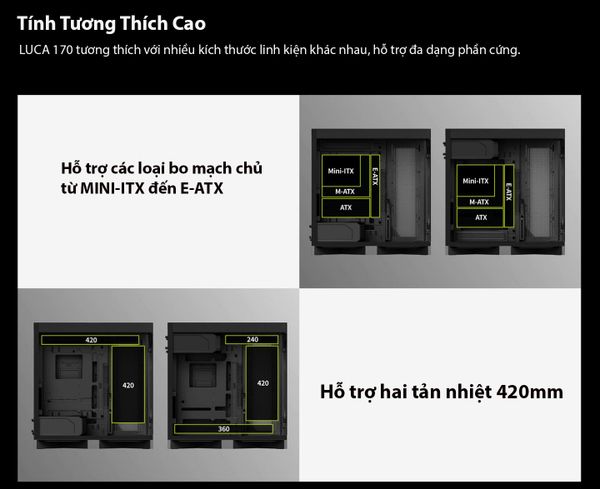 LUCA 170 hỗ trợ mainboard kích thước từ Mini-ITX đến E-ATX (tối đa 280mm), đủ không gian để lắp card đồ họa dài đến 460mm và tản nhiệt CPU cao 170mm. Ngoài ra, không gian sau main rộng 63mm cho phép quản lý dây cáp gọn gàng và hiệu quả.