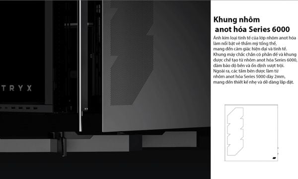 Toàn bộ khung sườn được chế tạo từ nhôm anodized series 6000, vừa nhẹ, vừa bền, lại có bề mặt ánh kim sang trọng. Hai tấm hông bằng nhôm series 5000 dày 2mm đảm bảo sự ổn định, đồng thời dễ dàng tháo lắp khi cần bảo trì hay nâng cấp.