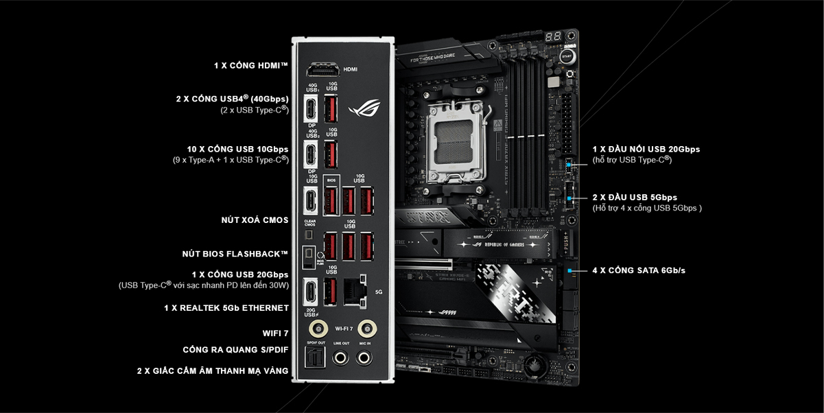 Ngoài ra, bo mạch còn tích hợp WiFi 7, Realtek 5Gb Ethernet và 2 cổng USB4® Type-C 40Gbps, mang đến tốc độ kết nối nhanh chóng, sẵn sàng cho cả gaming chuyên nghiệp lẫn ứng dụng AI thế hệ mới.