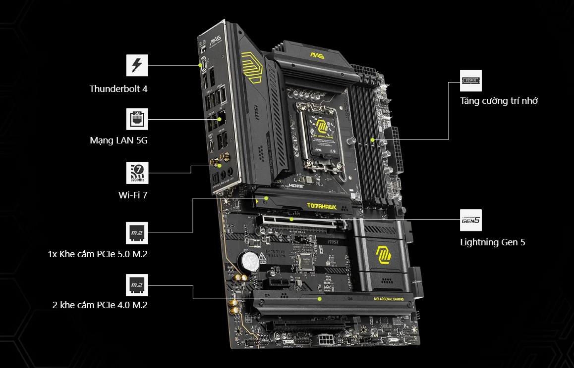 MSI MAG B860 TOMAHAWK WIFI là lựa chọn lý tưởng cho game thủ và người dùng chuyên nghiệp muốn sở hữu một bo mạch chủ ổn định, mạnh mẽ, kết nối siêu tốc và dễ dàng lắp ráp. Với DDR5-9200+, PCIe 5.0, Thunderbolt 4, Wi-Fi 7 và LAN 5G, đây chính là nền tảng hoàn hảo để xây dựng một hệ thống PC chiến game và làm việc đỉnh cao.